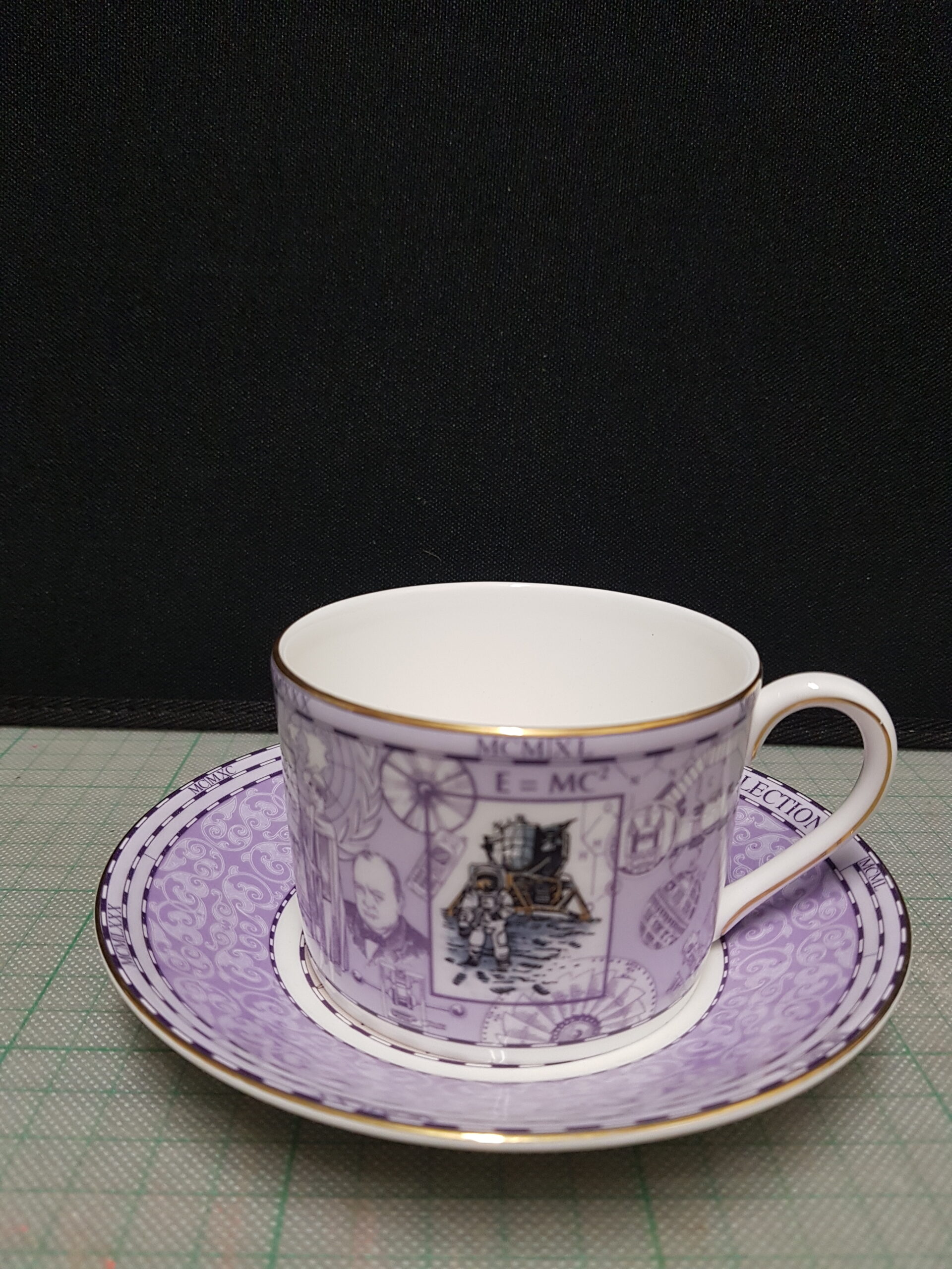 Nieuwe kop en schotel uit de Millennium serie van Wedgwood. Met historische afbeeldingen. Afmetingen: diameter kop 8,5 cm, hoog 6 cm, schoteltje 14 cm.